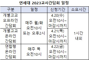 신청일정은 간담회마다 다르다. 개별고교 오프라인 간담회는 20일, 개별고교 온라인 간담회는 21일, 연합형 온라인 간담회는 22일이다. 시간은 모두 오전10시로 동일하며 입학처 홈페이지에서 선착순으로 접수한다.