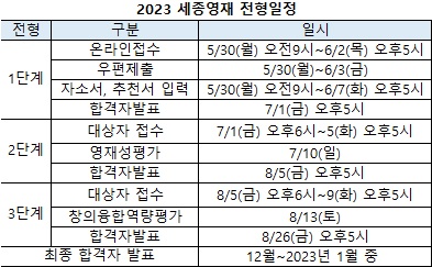 [베리타스알파=한정현 기자] 세종과학예술영재학교(이하 세종영재)가 2023학년 모집요강을 최근 밝혔다. 모집인원은 정원내 84명, 정원외 사회통합대상자 4명 이내, 외국인 2명 이내로 전년과 동일하다. 달라진 점은 사회통합전형의 평가방법이다. 올해부터는 2단계 면접/관찰평가를 따로 진행하지 않고, 일반/외국인전형과 동일하게 영재성 검사를 실시한다. 특히 영재학교 중 2023학년 모집요강을 처음 공개한 것으로, 지난 3월 2단계 기출문제를 처음 공개한 데 이어 수요자친화적 행보가 돋보인다.