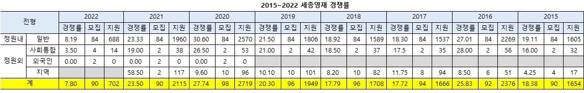 2022학년 영재학교 입시에서 세종영재는 정원내 기준 8.19대1의 경쟁률을 기록했다. 2021학년 23.33대1, 2020학년 30.60대1이 넘는 경쟁률을 기록한 것에 비해서는 3분의1 이상 감소한 모습이다. 작년 처음으로 적용된 영재학교 중복지원 금지의 영향이 가장 컸던 것으로 분석된다. 중복지원 금지가 시행되면서 2022학년 이전의 경쟁률과 비교하기 어려워진 측면도 있다.