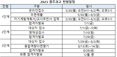 원서접수는 5월30일 오전9시부터 6월2일 오후5시까지 원서접수 사이트를 통해 가능하다. 2022학년과 마찬가지로 영재학교 중복지원은 금지되니 유의해야한다. 우편 서류제출은 5월30일부터 6월3일까지로, 6월3일 소인까지만 인정된다. 자기계발계획서/교사추천서 입력은 5월30일 오전9시부터 6월3일 오후5시까지 가능하다. 1단계 합격자는 7월1일 학교 홈페이지를 통해 확인 가능하다.