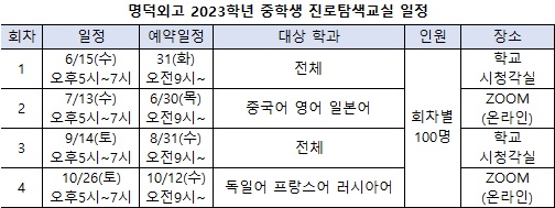 [베리타스알파=한정현 기자] 명덕외고가 중학생 대상 진로탐색교실 프로그램 일정을 최근 밝혔다. 전체 일정은 4회로 나눠 진행되며, 온라인/오프라인 각 2회로 구성됐다. 오프라인은 6월15일과 9월14일, 온라인은 7월13일과 10월26일 진행된다. 공통 내용은 중학생을 위한 대입특강, 학과 소개, 기숙사, 학교생활, 자소서/면접팁 등으로 구성된다. 다만 전학과를 대상으로 진행하는 오프라인 회차와 다르게 온라인 회차는 회차마다 대상 학과가 다르다. 2회는 중국어 영어 일본어과, 4회는 독일어 프랑스어 러시아어다.