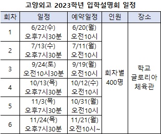 [베리타스알파=한정현 기자] 고양외고가 2023학년 신입생 모집을 위한 입학설명회 진행일정을 최근 밝혔다. 6월22일부터 11월24일까지 전체 6회로 진행된다. 1차는 6월22일, 2차는 7월13일, 3차는 9월24일, 4차는 10월13일, 5차는 11월3일, 6차는 11월24일이다. 내용은 학교 교육과정 소개, 재학생의 학교생활/진학준비 팁 안내, 전형안내와 질의응답 등으로 구성된다. 다만 입학홍보부 관계자는 "일정과 수용인원은 학교사정, 코로나19 상황에 따라 변동이 있을 수 있다"고 전했다.