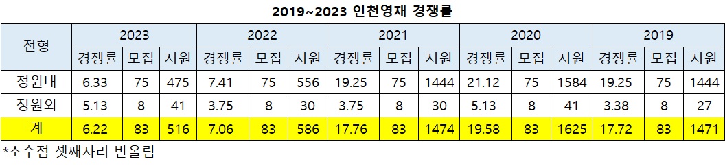 [베리타스알파=한정현 기자] 2일 오후5시 원서접수를 마감한 영재학교 인천과학예술영재학교(인천영재)의 2023학년 경쟁률은 정원내 기준 6.33대1(모집인원75명/지원인원475명)로 나타났다. 지난해 7.41대1(75명/556명)보다 하락했다. 모집인원은 75명으로 전년과 동일하지만 지원자가 81명 감소한 것이다. 2022학년과 마찬가지로 영재학교 중복지원 금지, 의약학계열 지원 제한 등의 영향을 받은 것으로 보인다. 정원외 전형에서는 5.13대1(8명/41명)을 기록했다. 전년 3.75대1(8명/30명) 대비 지원자가 11명 증가해 경쟁률이 상승한 점이 눈에 띈다. 다만 2022학년부터 영재학교 간 중복지원 금지가 시행되면서 2022학년 이전 경쟁률과 비교하기엔 다소 어려운 부분이 있음을 참고해야한다.