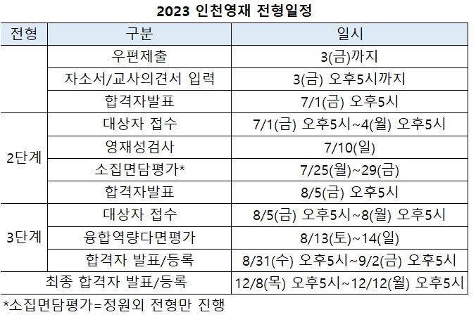 인천영재의 2023학년 신입생 모집인원은 정원내 일반전형 75명, 정원외 사회통합전형 8명 이내다. 일반전형에는 지역인재 우선선발 인원 40명 내외가 포함됐다. 모두 전년과 모집인원이 동일하다.
