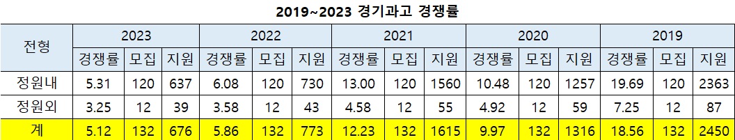 [베리타스알파=한정현 기자] 2일 오후5시 원서접수를 마감한 영재학교 경기과고의 2023학년 경쟁률은 정원내 기준 5.31대1로 나타났다. 모집인원 120명에 637명이 지원한 결과다. 전년 6.08대1(모집인원120명/지원인원730명)보다 하락한 수치다. 전년과 모집인원은 동일하지만 지원자가 93명 감소했다. 2022학년과 마찬가지로 영재학교 중복지원 금지, 의약학계열 지원 제한 등의 영향을 받은 것으로 보인다. 정원외 전형에서는 3.25대1(12명/39명)을 기록했다. 전년 3.58대1(12명/43명)보다 소폭 하락했다. 4일 오전10시 기준 학교 홈페이지에는 경쟁률 현황이 공지되지 않았지만, 수원지원교육청이 발표한 '경기과고 2023학년 신입생 지원 마감' 자료에 기반한 수치다.