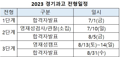 경기과고의 2023학년 모집인원은 정원내 일반 120명, 정원외 추천관찰 12명 이내다. 일반전형 모집인원에는 지역인재 선발 47명이 포함됐다. 모두 전년과 모집인원이 동일하다. 지역인재선발은 경기도 산하 31개 기초자치단체와 경기도 이외 16개 광역자치단체에서 1명씩 모두 47명을 선발한다. 선발 대상은 2단계 전형결과 순위가 정원의 2배수 이내이면서 각 지역별 1위인 지원자로, 모든 전형단계를 일반전형과 동일하게 진행한다.