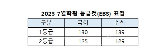 [베리타스알파=권수진 기자] EBS가 발표한 오후7시35분 기준 2023 7월학평(2022년 7월 모의고사) 표준점수 기준 예상 1등급컷은 국어 130점, 수학 139점이다. 2등급컷은 국어 125점, 수학 129점으로 봤다.