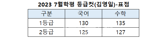 [베리타스알파=권수진 기자] 김영일교육컨설팅이 발표한 오후7시50분 기준 2023 7월학평(2022년 7월 모의고사) 표준점수 기준 예상 1등급컷은 국어 130점, 수학 135점이다. 2등급컷은 국어 125점, 수학 127점으로 봤다.