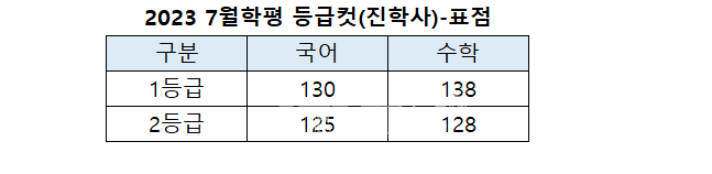 [베리타스알파=권수진 기자] 진학사가 발표한 오후7시53분 기준 2023 7월학평(2022년 7월 모의고사) 표준점수 기준 예상 1등급컷은 국어 130점, 수학 138점이다. 2등급컷은 국어 125점, 수학 128점으로 봤다.