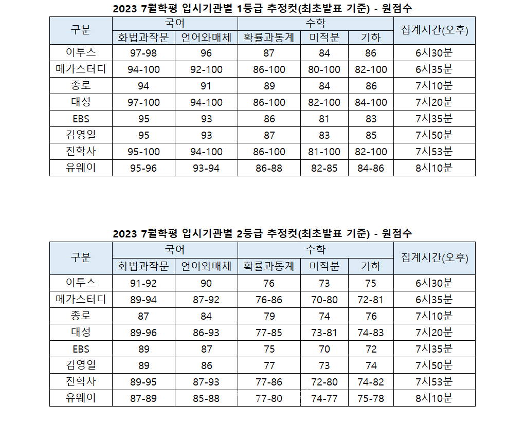 [베리타스알파=권수진 기자] 6일 실시한 2023 7월학평(2022년 7월 모의고사)의 등급컷을 주요 입시기관들은 어떻게 예측했을까. 8개 입시기관(김영일 대성 메가 유웨이 이투스 종로 진학사 EBS, 가나다 순)이 최초 발표한 추정 1등급컷을 집계/분석한 결과 원점수 단일점수로 예측한 기준, 화법과작문은 94~95점, 언어와매체는 91~96점, 확률과통계는 86~89점, 미적분은 81~84점, 기하는 83~86점이다. 범위로 예측한 경우는 제외한 점수다.