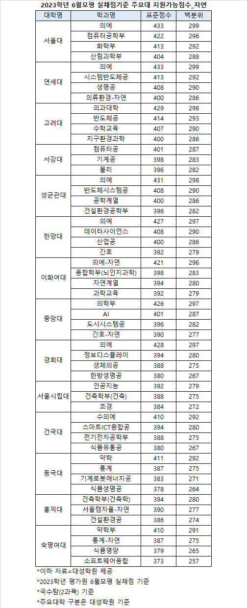 상위 14개교의 자연계 최고/최저 표점을 통한 지원 가능선을 살펴보면, 서울대 433점(의예)~404점(산림과학), 연대 433점(의예)~400점(의류환경(자연)), 고대 429점(의대)~400점(지구환경과학), 서강대 401점(컴공)~396점(물리), 성대 431점(의예)~396점(건설환경공), 한대 427점(의예)~392점(간호), 이대 421점(의예(자연))~392점(과학교육), 중대 426점(의예)~390점(간호(자연)), 경희대 428점(의예)~380점(한방생명공), 시립대 392점(인공지능)~384점(조경), 건대 410점(수의예)~380점(식품유통공), 동대 411점(약학)~378점(식품생명공), 홍익대 394점(건축학)~386점(건설환경공), 숙대 410점(약학)~373점(소프트웨어융합) 등이다.