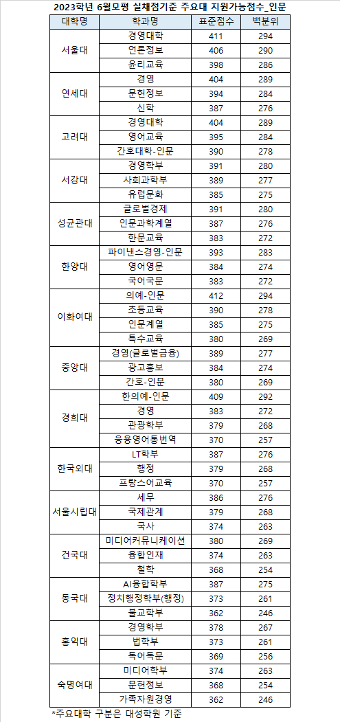 대학별로 인문계 예상 합격선을 살펴보면, 서울대 411점(경영)~398점(윤리교육), 연대 404점(경영)~387점(신학), 고대 404점(경영)~390점(간호(인문)), 서강대 391점(경영)~385점(유럽문화), 성대 391점(글로벌경제)~383점(한문교육), 한대 393점(파이낸스경영(인문))~383점(국어국문), 이대 412점(의예(인문))~380점(특수교육), 중대 389점(경영(글로벌금융))~380점(간호(인문)), 경희대 409점(한의예(인문))~370점(응용영어통번역), 외대 387점(LT학부)~370점(프랑스어교육), 시립대 386점(세무)~374점(국사), 건대 380점(미디어커뮤니케이션)~368점(철학), 동대 387점(AI융합)~362점(불교), 홍익대 378점(경영)~369(독어독문), 숙대 374점(미디어)~362점(가족자원경영)의 분포로 분석된다.