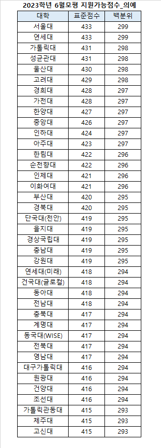 의대는 대학별로 서울대/연대 각 433점(299점), 가톨릭대/성대 각 431점(298점), 울산대 430점(298점), 고대 429점(298점), 가천대/경희대 각 428점(297점), 한대 427점(297점), 중대 426점(297점), 인하대 424점(297점), 아주대 423점(297점), 순천향대/한림대 각 422점(296점), 이대/인제대 각 421점(296점), 경북대/부산대 각 420점(295점), 강원대/경상국립대/단국대(천안)/을지대/충남대 각 419점(295점), 건국대(글로컬)/동아대/연세대(미래)/전남대 각 418점(294점), 계명대/동국대(WISE)/전북대/충북대 각 417점, 영남대 417점(294점), 건양대/대구가톨릭대/원광대/조선대 각 416점(294점), 가톨릭관동대/고신대/제주대 각 415점(293점)인 것으로 추정된다.