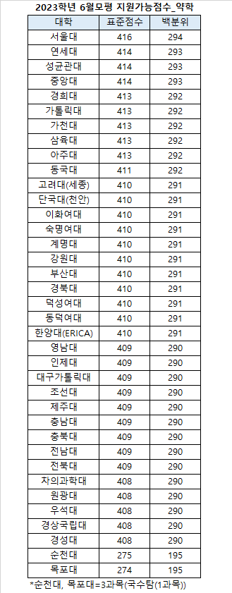 이어 서울대 화학/연대 시스템반도체공 각 413점(292점), 동국대 약학 411점(292점), 건국대 수의예/숙명여대 약학 410점(291점), 성대 반도체시스템공/연대 생명공/한대 데이터사이언스 각 408점(290점), 고대 수학교육 407점(290점), 서울대 산림과학 404점(288점), 서강대 컴퓨터공/중대 AI 각 401점(287점), 고대 지구환경과학/성대 공학계열/연대 의류환경-자연/한대 산업공 각 400점(286점) 순으로 표점 400점 이상 합격선으로 추정된다.