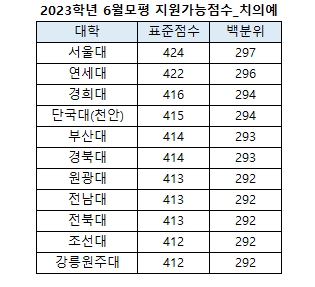 치대는 서울대 424점(297점), 연대 422점(296점), 경희대 416점(294점), 단국대(천안) 415점(294점), 경북대/부산대 각 414점(293점), 원광대/전남대/전북대 각 413점(292점), 강릉원주대/조선대 각 412점(292점)일 것으로 보인다.