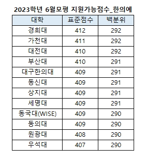 이어 서강대 경영/성대 글로벌경제 각 391점(280점), 고대 간호-인문/이대 초등교육 각 390점(278점), 서강대 사회과학부/중대 경영(글로벌금융) 각 389점(277점), 성대 인문과학계열/연대 신학/한국외대 LT학부 각 387점(276점), 동대 AI융합학부 387점(275점), 시립대 세무 386점(276점), 서강대 유럽문화전공(유럽문화)/이대 인문계열 각 385점(275점), 중대 광고홍보/한대 영어영문 각 384점(274점), 경희대 경영/성대 한문교육/한대 국어국문 각 383점(272점), 건대 미디어커뮤니케이션/이대 특수교육/중대 간호-인문 각 380점(269점) 순으로 표점 380점 이상 지원 가능선으로 추정된다.