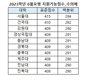 수의대는 서울대 415점(294점), 건대 410점(292점), 강원대 409점(290점), 경북대/경상국립대/충남대/충북대 각 409점(291점), 전남대/전북대/제주대 각 408점(290점)로 예측된다.