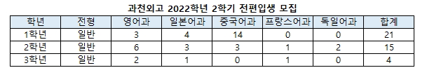 [베리타스알파=김하연 기자] 과천외고는 2022학년 2학기 전편입생을 모집한다고 최근 밝혔다. 모집인원은 정원내 기준 일반전형 1학년 21명, 2학년 15명, 3학년 4명, 총40명을 모집한다. 사회통합전형은 별도문의를 통한다.