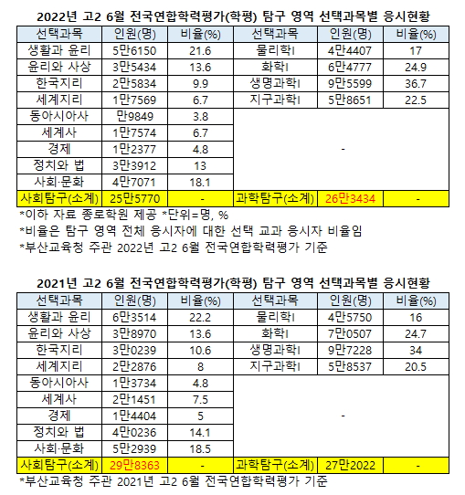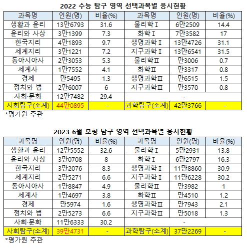 심지어 올해 고3 재학생과 N수생이 응시한 2022년(2023학년) 6월모평 채점 결과를 보면 아직 사탐이 더 많다. 사탐은 39만4731명, 과탐은 27만2269명으로 사탐이 2만2462명 더 많다. 지난해 첫 통합수능으로 치러진 2022수능에서도 사탐 응시자 39만4731명, 과탐 응시자 37만2269명으로 사탐이 2만2462명 더 많다.