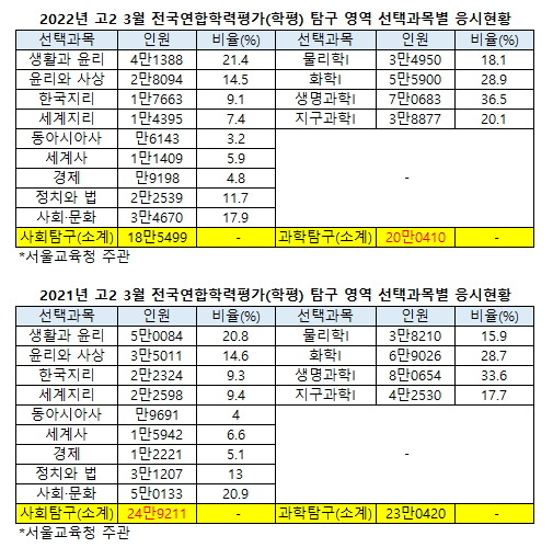 종로학원의 ‘2022년 고2 3월학평/6월학평 통계자료 분석’에 따르면, 최근 치러진 고2 6월학평에서 과탐 전체 응시자(이과)가 26만3434명으로 사탐 전체 응시자(문과) 25만5770명보다 7664명 더 많다. 이미 고2는 3월학평부터 과탐 응시자가 사탐 응시자를 추월한다. 사탐은 18만5499명, 과탐은 20만410명으로 과탐 응시자가 1만4911명 더 많다. 이처럼 과탐 응시자가 사탐 응시자를 추월한 건 역대 수능 모의고사에서 첫 역전한 사례다. 과탐은 물리학Ⅰ 화학Ⅰ 생명과학Ⅰ 지구과학Ⅰ, 사탐은 생활과윤리 윤리와사상 한국지리 세계지리 동아시아사 세계사 경제 정치와법 사회문화에 응시한 학생 기준이다.