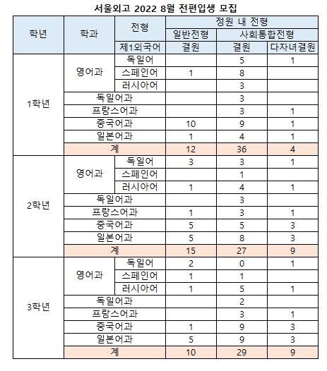 [베리타스알파=김하연 기자] 서울외고는 2022학년 8월 전편입생 모집을 실시한다고 최근 밝혔다. 모집인원은 정원내 기준 1학년 52명, 2학년 51명, 3학년 48명이다. 전형별로 구분하면 1학년 일반전형 12명, 사회통합전형 40명, 2학년 일반전형 15명, 사회통합전형 36명, 3학년 일반전형 10명, 사회통합전형 38명이다. 2단계 전형으로 1단계에서 서류평가를 진행하고, 2단계 면접점수를 합산해 고득점 순으로 최종합격자를 정한다.