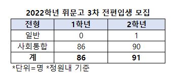 [베리타스알파=조혜연 기자] 휘문고가 2022 3차 전편입생을 모집한다고 17일 밝혔다. 모집인원은 정원내 기준으로 1학년 86명 2학년 91명이다. 1학년은 모두 사회통합전형으로만, 2학년은 일반전형으로 1명 사회통합으로 90명을 모집한다. 지원자는 한 가지 전형에만 지원할 수 있고 모집인원은 추첨 당일까지 변동될 수 있다.