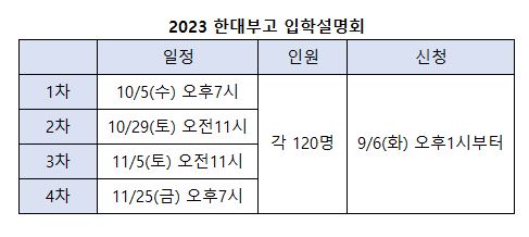 신청은 학교 홈페이지에서 9월6일 오후1시부터 할 수 있다. 선착순으로 접수를 마감할 예정이다. 한대부고 측은 정확한 참가 인원 파악을 위해 학생과 학부모가 함께 오는 경우에도 별도의 이름으로 각각 신청할 것을 당부했다. 코로나 상황으로 인해 신청한 인원 외에는 설명회에 입장할 수 없다.