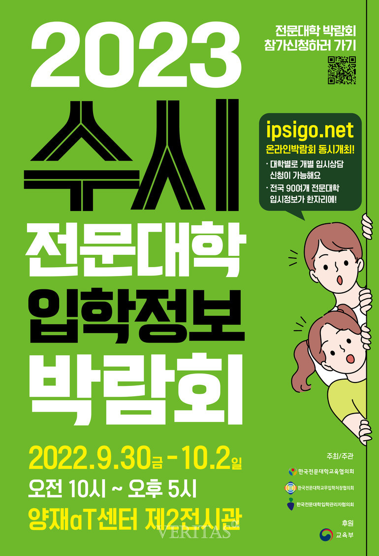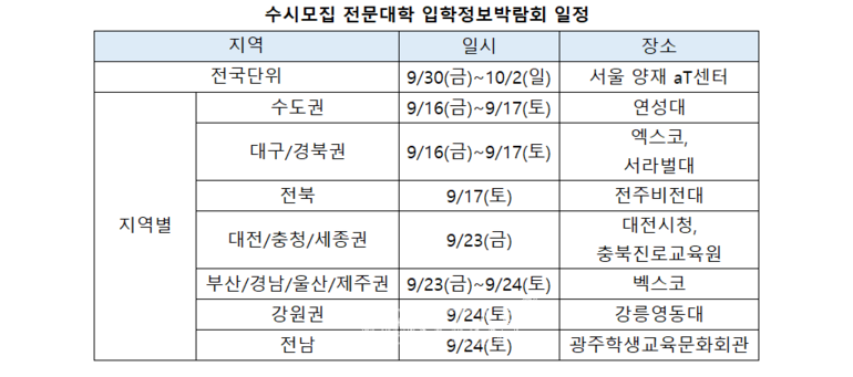 [베리타스알파=권수진 기자] 올해 전국권 ‘수시모집 전문대학 입학정보 박람회’가 서울 양재 aT센터에서 9월30일부터 10월2일까지 열린다.