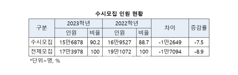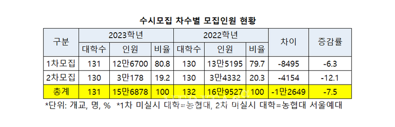 정원내 모집인원은 13만1090명(83.6%)으로 2022학년 13만8311명보다 7221명(5.2%) 줄었고, 정원외 모집인원은 2만5788명(16.4%)으로 2022학년 3만1216명보다 5428명(17.4%) 감소했다. 전체 모집인원 대비 비중으로 따지면 정원내 비율은 확대된 반면, 정원외 비율은 줄었다. 정원내는 2022학년 81.6%에서 2023학년 83.6%로 확대, 정원외는 2022학년 18.4%에서 2023학년 16.4%로 축소됐다.