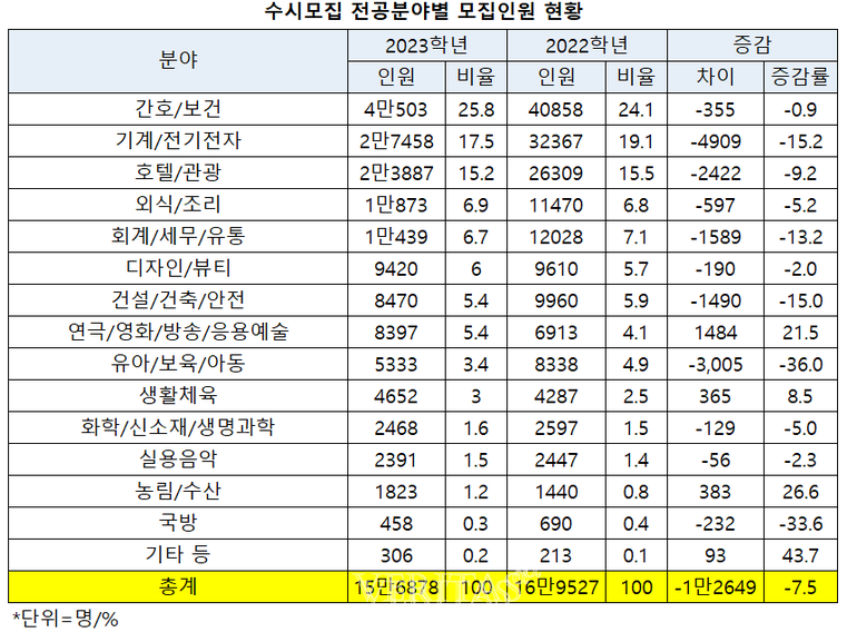 전문대학에서 모집규모가 가장 큰 전공은 간호/보건 분야다. 2022학년 4만858명보다 355명 줄어든 4만503명을 모집한다. 모집인원 자체는 줄었지만 전체 모집인원 대비 차지하는 비중은 25.8%로 전년 24.1%보다도 확대됐다.
