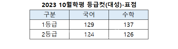 [베리타스알파=권수진 기자] 대성마이맥이 발표한 오후7시15분 기준 2023 10월학평(2022년 10월 모의고사) 표준점수 기준 예상 1등급컷은 국어 129점, 수학 137점이다. 2등급컷은 국어 124점, 수학 126점으로 봤다.