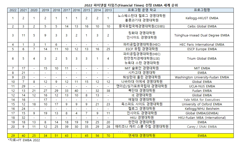[베리타스알파=김하연 기자] 영국의 파이낸셜 타임즈(Financial Times, FT)가 선정하는 ‘2022 EMBA(최고경영자과정) 순위’에서 연세대가 국내대학 중 유일하게 톱100에 이름을 올렸다. 지난해 국내2위 세계40위를 기록한 연대는 11계단이나 상승하며 올해 국내1위 세계29위로 껑충 뛰어올랐다. 다만 최고순위를 기록했던 2020년 세계25위보다는 네 계단 낮다. EMBA는 Executive MBA의 약자로 최고경영자/중간관리자를 위한 과정이다. 주로 일반 학생을 대상으로 하는 주간 Full-time MBA와는 구별된다.