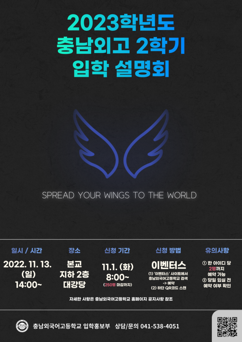 [베리타스알파=조혜연 기자] 충남외고가 2023학년 예비 신입생을 위한 2학기 입학설명회를 운영한다고 19일 밝혔다. 11월13일 오후2시부터 충남외고 지하2층 대강당에서 진행한다. 설명회는 효율적인 대입을 위한 전형의 이해와 준비 특강, 재학생 전공어 발표, 학교 교육과정 안내, 2023 신입생 입학전형 안내, 예비신입생을 위한 지원준비 팁, 질의응답, 학교/기숙사 견학 등으로 구성된다. 중학교 졸업자와 졸업예정자, 학부모를 대상으로 하며 선착순 250명까지 참석 가능하다.
