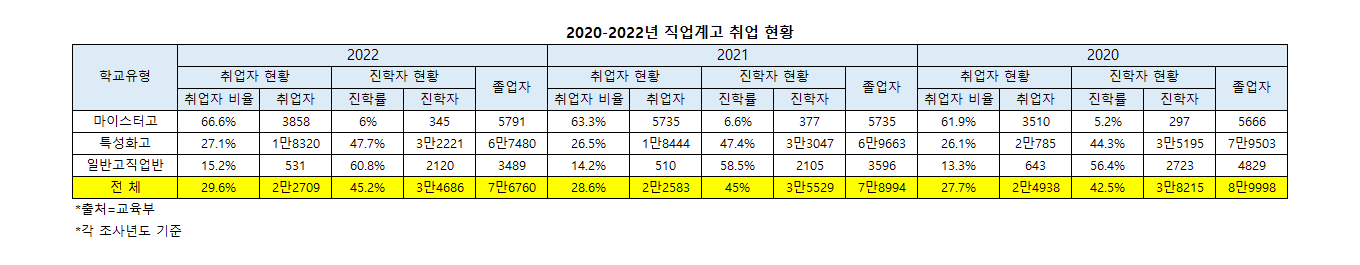 반면 특성화고와 일반고직업반의 경우 취업률이 저조하고 진학률이 높은 것으로 나타났다. 2022년 특성화고 졸업자 중 취업자 비율은 27.1%에 그쳤고 진학자는 47.7%에 달했다. 졸업생 6만7480명 중 1만8320명만이 취업을, 3만2221명이 진학을 선택한 결과다. 일반고직업반의 경우 2022년 졸업자 중 15.2%만 취업을 선택했고 60.8%는 진학한 것으로 조사됐다. 전체 졸업생 3489명 중 취업자는 531명, 진학자는 2120명이다. 두 고교유형 모두 취업자보다 진학자 수가 압도적으로 높은 상황이다.