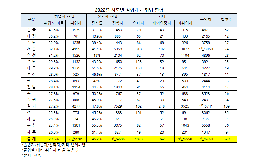 반대로 진학률은 제주가 61.4%(졸업자 1347명/진학자 827명)으로 가장 높다. 이어 부산 55.3%(5558명/3075명), 대구 51.5%(4227명/2175명), 충북 50.2%(3523명/1767명)에서 절반 이상의 직업계고 졸업자가 취업 대신 진학을 택한 것으로 나타났다. 진학률이 가장 낮은 곳은 취업자 비율이 가장 높은 경북 31.1%(1939명/1453명)이다.