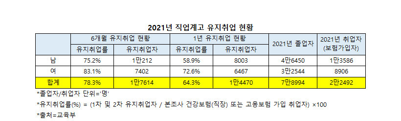 일자리의 질적 수준을 따져볼 수 있는 유지취업률도 심각하다. 유지취업률은 졸업생이 취업 상태를 유지하고 있는지 조사하는 통계자료로, 6개월 기간을 두며 집계한다. 교육부와 한국교육개발원 자료를 살펴보면 2020년 4월1일 기준 직업계고 졸업 뒤 첫 직장에 들어간 2만2492명 중 6개월 이상 취업 상태를 유지하고 있는 졸업생은 1만7614명(78.3%)으로 나타났다. 4878명(21.7%)이 6개월 사이 퇴사를 선택한 것이다. 1년 이상 취업 상태를 유지하고 있는 졸업생은 1만4470명(64.3%)으로 14%p 더 떨어졌다.