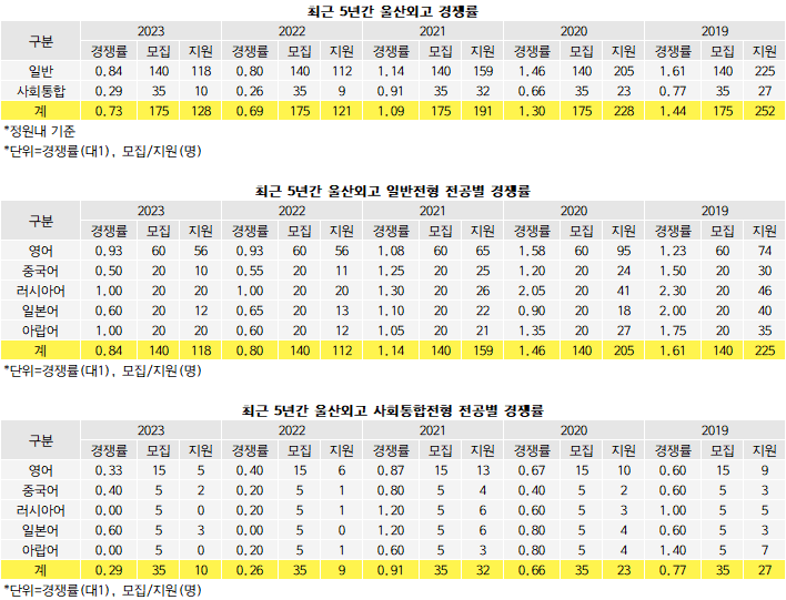 울산외고의 2023 최종경쟁률은 0.73대1이다. 175명 모집에 128명이 지원했다. 2019학년 1.44대1(175명/252명), 2021학년 1.09대1(175명/191명), 2020학년 0.69대1(175명/121명)의 추이로 계속 하락하다가 올해 상승세로 접어들었다.