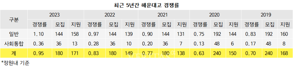 올해 해운대고의 경쟁률은 0.95대1(180명/171명)로 지난해 0.83대1(180명/149명)보다는 상승했지만 일반/사회통합 합산 기준 미달이었다. 최근 5년간 경쟁률은 2019학년 0.7대1(240명/168명), 2020학년 0.63대1(240명/150명), 2021학년 0.77대1(180명/138명), 2022학년 0.83대1(180명/149명), 2023학년 0.95대1(180명/171명) 순으로 계속해서 미달을 기록 중이다.