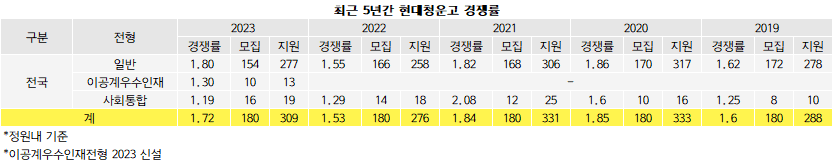 현대청운고의 올해 경쟁률은 1.72대1(180명/309명)을 기록했다. 지난해와 동일한 모집규모였지만 지원자가 276명에서 309명으로 33명 늘었다. 2019학년 1.6대1(180명/288명), 2020학년 1.85대1(모집180명/지원333명), 2021학년 1.84대1(180명/331명), 2022학년 1.53대1(180명/276명)로 등락을 반복하다가, 올해는 상승했다.