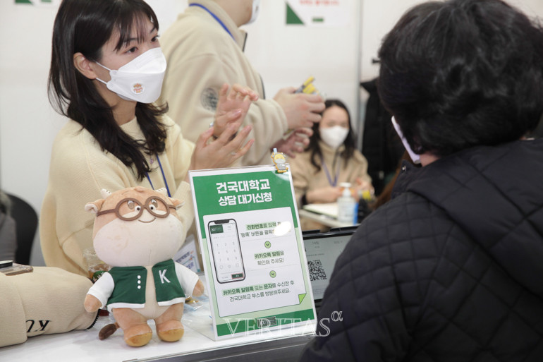[베리타스알파=김하연 기자] 2023정시박람회 건국대 부스에서 한 학부모가 상담대기신청 방법을 문의하고 있다. 2023정시박람회는 12월15일부터 17일까지 사흘간 서울 삼성동 코엑스 A홀에서 진행된다.