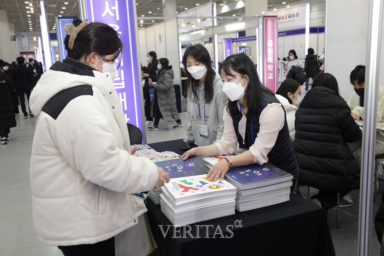 [베리타스알파=김하연 기자] 2023정시박람회 서울시립대 부스에서 한 수험생에게 입시자료를 배포하고 있다. 2023정시박람회는 12월15일부터 17일까지 사흘간 서울 삼성동 코엑스 A홀에서 진행된다.