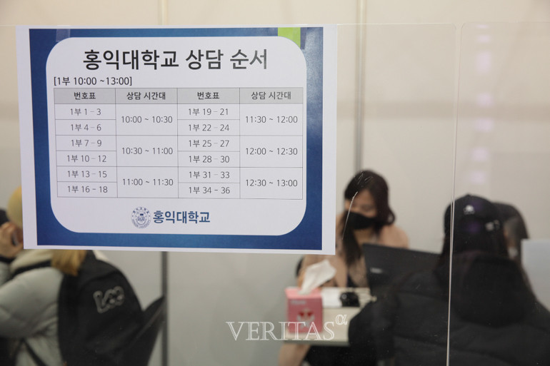 [베리타스알파=신현지 기자] 15일 대교협 2023정시박람회 홍익대 부스는 시간대별로 개별 입학상담을 제공한다. 2023정시박람회는 15일부터 17일까지 사흘간 서울 삼성동 코엑스 1층 A홀에서 진행된다.