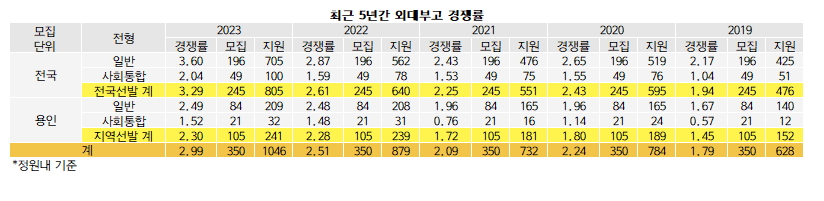전국모집에서는 일반이 3.6대1(196명/705명), 사회통합이 2.04대1(49명/100명)로 각각 전년 2.87대1(196명/562명), 1.59대1(49명/78명)보다 상승했다. 용인 지역선발 역시 일반 2.49대1(84명/209명), 사회통합 1.52대1(21명/32명)로 전년 2.48대1(84명/208명), 1.48대1(21명/31명)에서 상승했다.