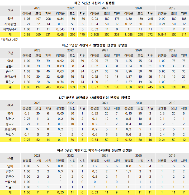 사회통합전형 경쟁률은 0.27대1(52명/14명)이다. 독일어의 경쟁률이 0.4대1(5명/2명)로 가장 높고, 영어 0.3대1(20명/6명), 일본어 0.27대1(11명/3명), 중국어 0.27대1(11명/3명) 순이다. 프랑스어는 5명 모집에 지원자는 0명이다.