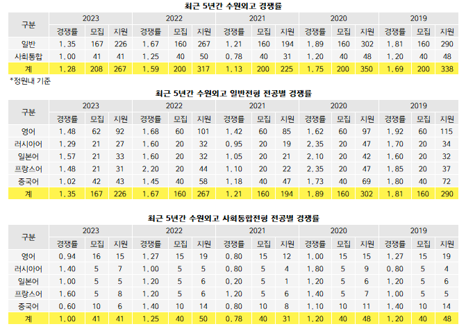 일반 기준, 최고경쟁률은 일본어가 기록했다. 21명 모집에 33명이 지원해 1.57대1의 경쟁률을 기록했다. 이어 프랑스어 1.48대1(21명/31명) 영어 1.48대1(62명/92명), 러시아어 1.29대1(21명/27명), 중국어 1.02대1(42명/43명) 순이다.
