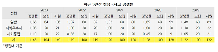 청심국제고의 경쟁률은 2019학년 1.32대1(100명/132명), 2020학년 1.28대1(100명/128명), 2021학년 1.2대1(100명/120명), 2022학년 1.19대1(100명/119명), 2023학년 1.43대1(104명/149명)으로 증감을 반복했다.