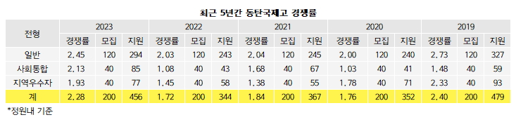 동탄국제고의 경쟁률은 2017학년 2.52대1(200명/503명), 2018학년 2.79대1(200명/557명), 2019학년 2.4대1(200명/479명), 2020학년 1.76대1(200명/352명), 2021학년 1.84대1(200명/367명), 2022학년 1.72대1(200명/344명), 2023학년 2.28대1(200명/456명) 증감을 반복했다.