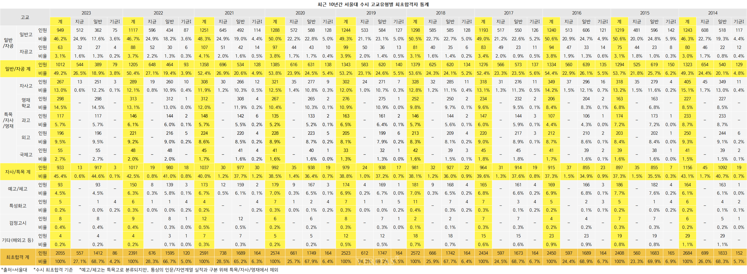 [베리타스알파=권수진 기자] 2023서울대 수시 최초 합격자 중 일반고(자공고 포함) 출신의 비중이 49.2%(1012명)로 지난해 50.4%(1205명)보다 한차례 더 줄어들었다. 서울대가 15일 발표한 ‘2023 서울대 수시모집 선발결과’를 통해 분석한 결과다. 2014학년 49.3% 이후 계속해서 50%를 넘겨왔지만 올해 9년 만에 절반 미만으로 줄어들었다. 서울대 수시에서 일반고 비중은 수시 모집인원이 줄어들기 시작한 2021학년부터 3년 연속 감소세를 이어오고 있다. 정시 확대의 여파가 일반고 선발 비중 축소로 계속해서 나타나고 있는 셈이다.