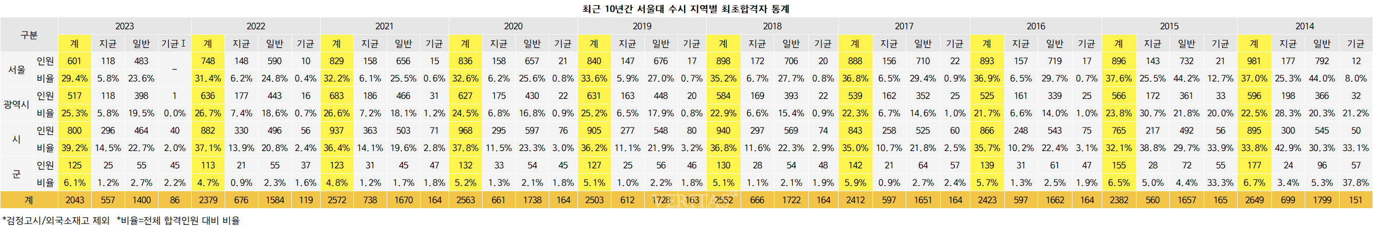 전년 대비 증감으로 보면 군 합격자 비중이 2022학년 4.7%(113명)에서 2023학년 6.1%(125명)로 늘어난 반면, 서울 비중은 2022학년 31.4%(748명)에서 2023학년 29.4%(601명)로, 광역시 비중은 2022학년 26.7%(636명)에서 2023학년 25.3%(517명)로 줄었다.