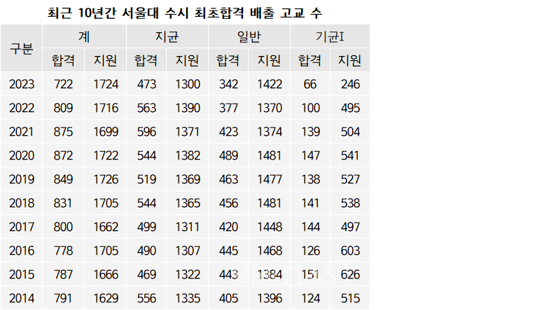 올해 서울대 수시 최초 합격자 배출 고교는 722개교로, 지난해 809개교보다 87개교 줄었다. 2016학년 이후 배출 고교가 확대되어 오다가 지난해 6년 만에 축소세로 돌아선 이후 계속해서 줄어들고 있다. 2016학년 778개교, 2017학년 800개교, 2018학년 831개교, 2019학년 849개교, 2020학년 872개교, 2021학년 875개교, 2022학년 809개교, 2023학년 277개교 순의 추이다.